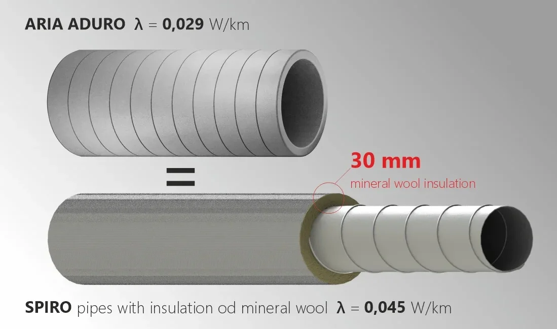 ARIA ADURO je sistem prezračevanja iz visoko izolativnega ekspandiranega polistirenskega materiala (EPS) za učinkovit prenos zraka v in iz enote rekupeartorja. Material, uporabljen v ARIA ADURO, je lahek, trpežen in obogaten z grafitom, zaradi česar je odporen na glive, plesen in bakterije.