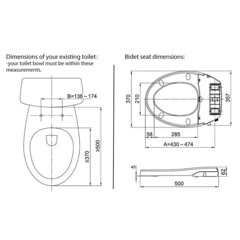 Visok samo neverjetnih 6cm. Tako daje videz običajnega modernega wc sedeža. Preprosta montaža - Zgolj nadomesti vašo obstoječo wc školjko, ter se priklopi na mrzlo vodo. Priklop na elektriko ni potreben! Visoko kvalitetno! Priklop iz medenine, kakovostna cev z kovinskim navojem priložena, šoba iz Anti-bakterijske umetne mase. Lasti si funkcijo samodejnega spiranja šobe pred in po uporabi. Nastavljiva moč curka, čiščenje spredaj in zadaj- dvojna šoba. Počasno zapiranje sedeža in pokrova - zaradi vrhunskega dušilca japonskega porekla je življenska doba 15+ let. Preprost za vzdrževanje: "quick release" funkcija za hitro odstranitev in namestitev
