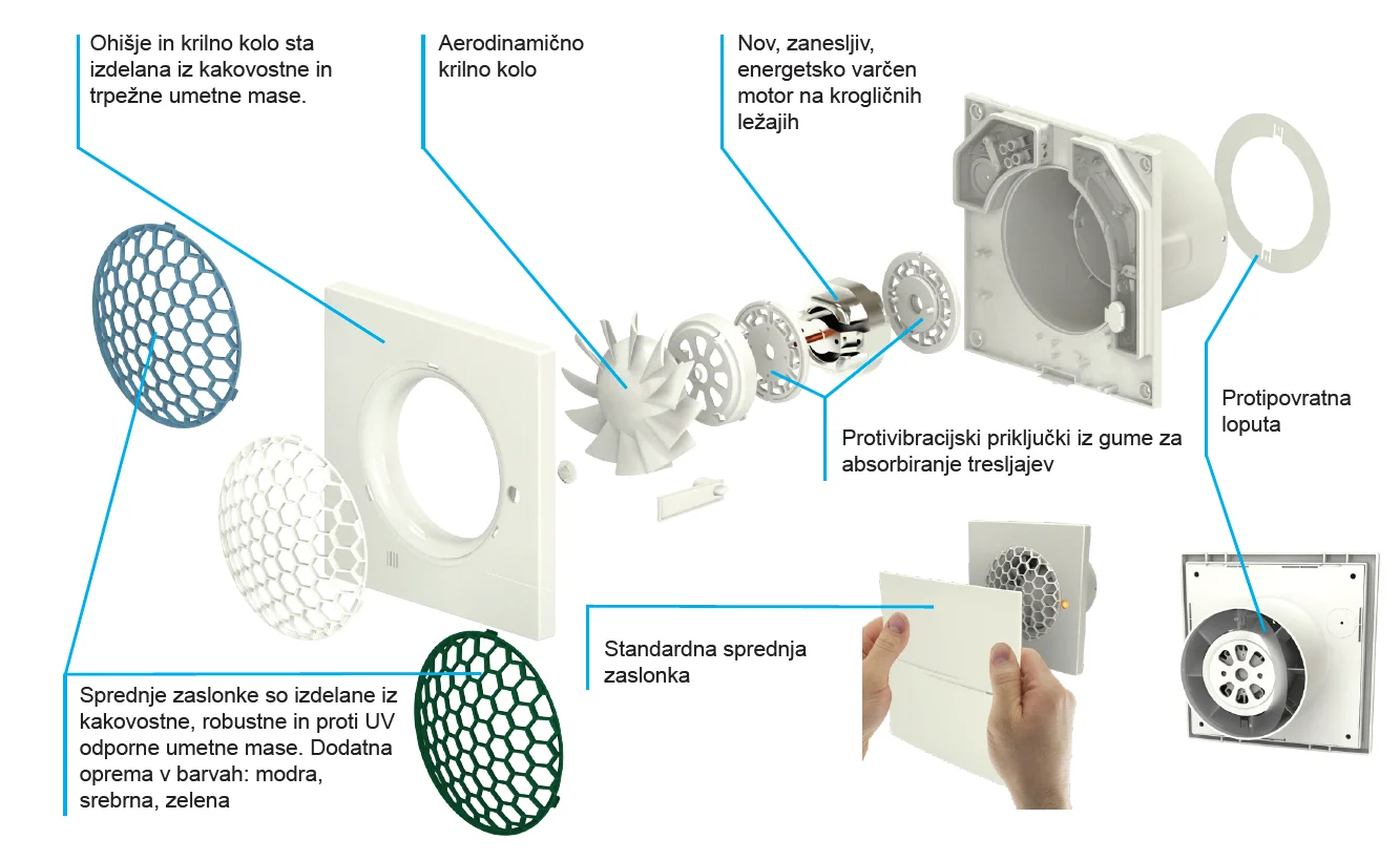 Zagotavlja maksimalen pretok zraka ob izjemno nizkem hrupu - primeren tudi za prhe!