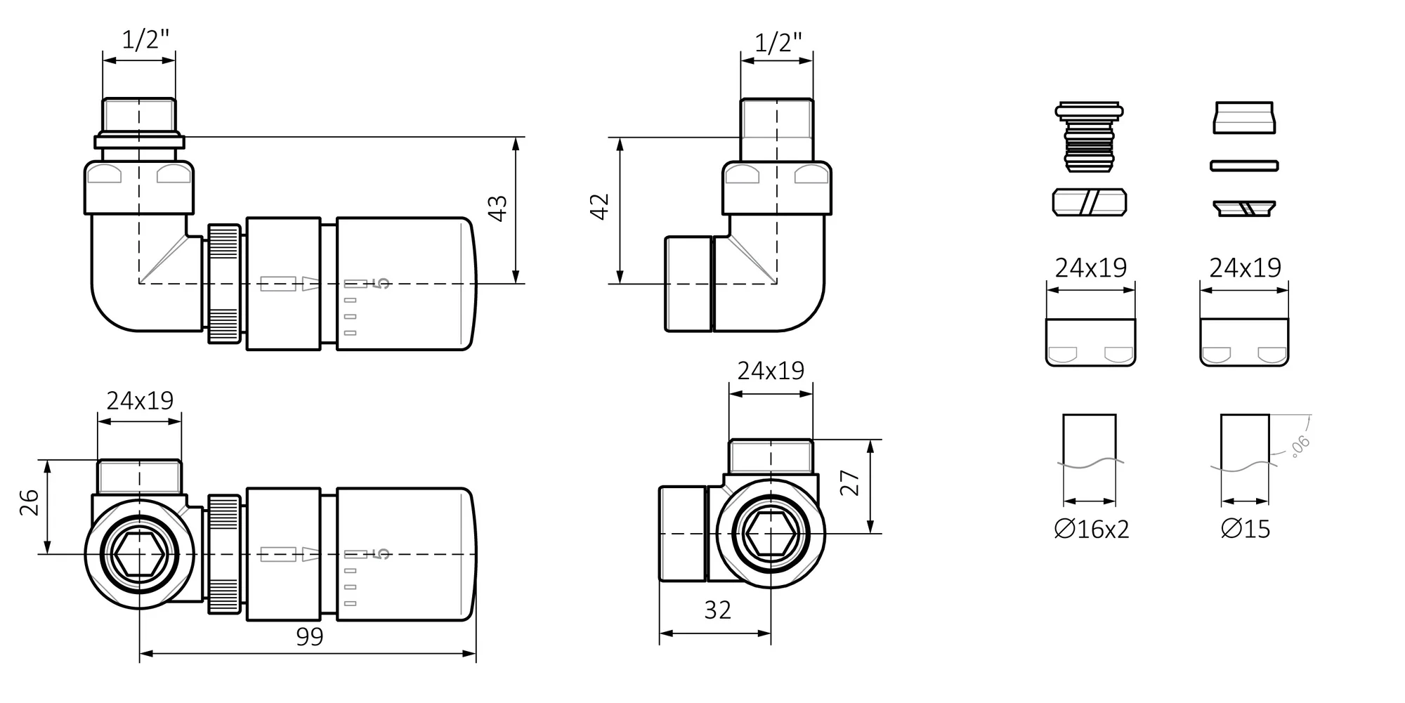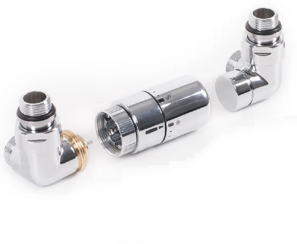 Set Terma DESIGN radiatorskih ventilov, 3-osni term., kotna DESNA izvedba, krom