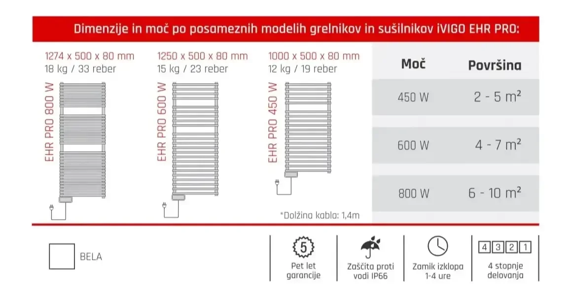 Električni radiatorji oz sušilniki VIGO EHR PRO so odlična in varna rešitev za vsak prostor. So popolnoma neodvisni od centralnega ogrevanja saj so samostojne enote in jih lahko uporabljate skozi vso leto.