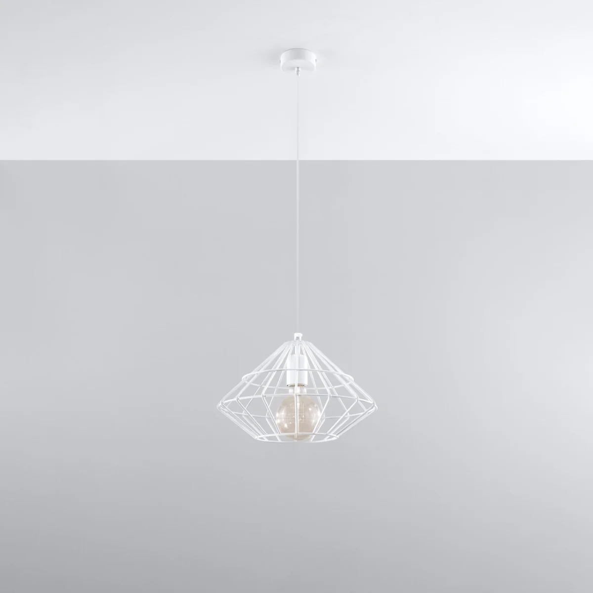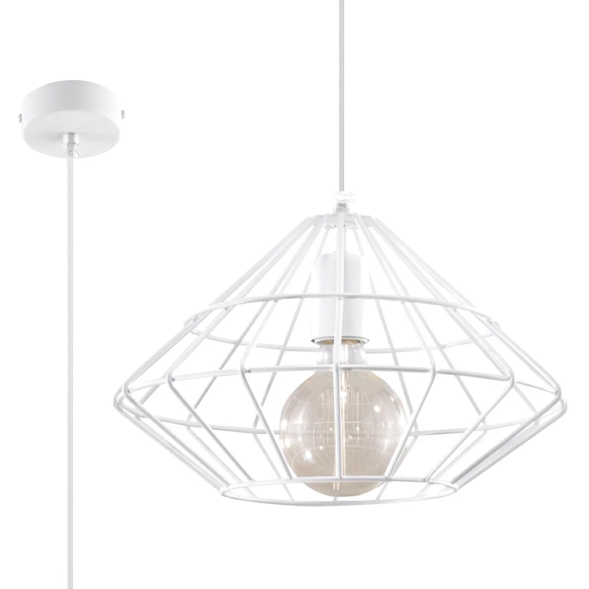 Jeklene svetilke UMBERTO s svojo obliko spominjajo na lepo obdelan diamant. Jeklene okvirje, obešene na nežni žici, bodo vsakemu notranjemu prostoru dodale edinstven značaj in postale izjemno okusen okras doma. UMBERTO se izstopajo s svojim industrijskim minimalizmom, vendar je njihova elegantna oblika navdihnjena s klasičnim oblikovanjem - ta edinstvena kombinacija ustvarja osvetlitev, ob kateri ni mogoče ostati ravnodušen. || Žarnica: E27, 1x60W, 1x15W LED, 50-60Hz, ~ 220-230V, IP20, razred naprave I Žarnica ni vključena. Dimenzije: 32/32/120 cm Dimenzija senčnika: 32/20 cm Material: jeklo Barva: bela