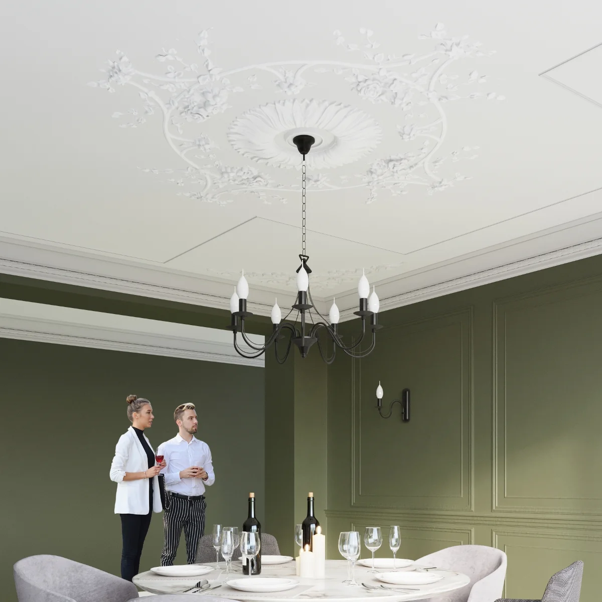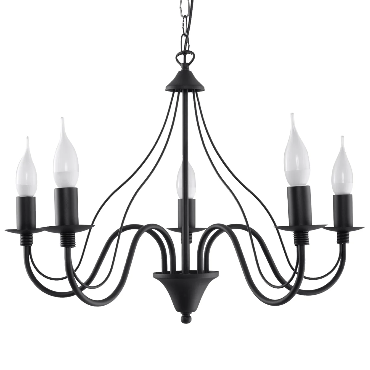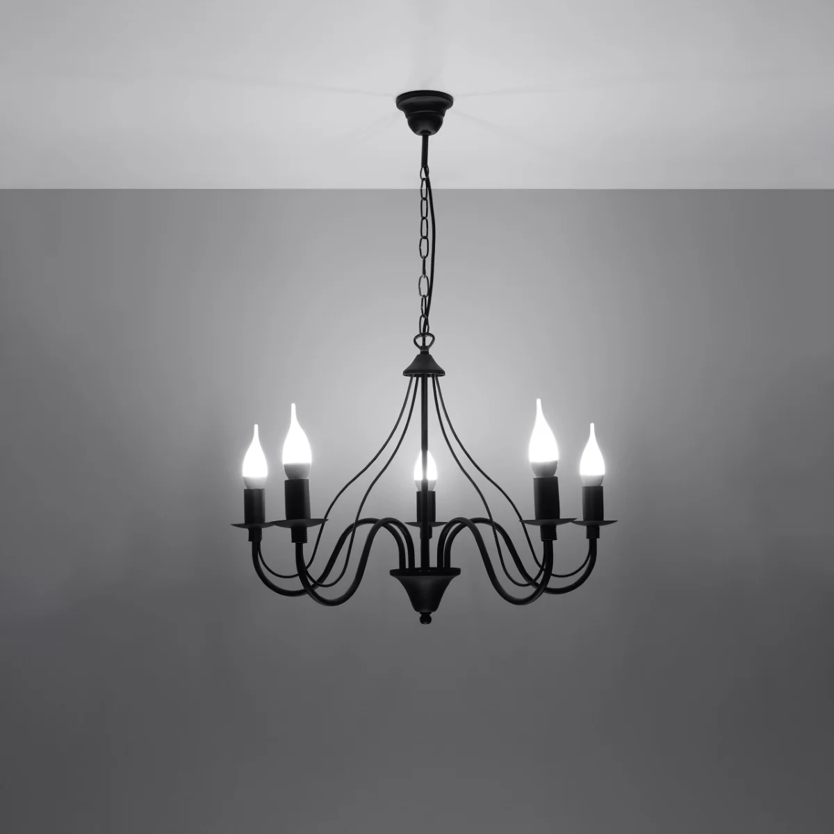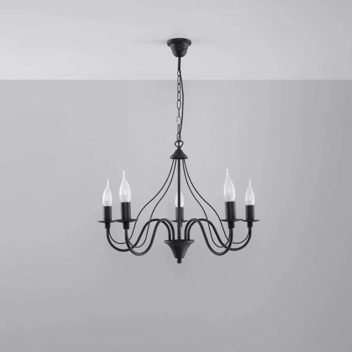 Sveče, nameščene na ukrivljenih kovinskih rokah, so izjemno učinkovit element notranjosti. Serija MINERVA svetilk bo všeč tudi največjim poznavalcem, ki cenijo izvirne predmete in prefinjene aranžmaje. Elegante svetilke, navdihnjene s svečniki, v preprosti, klasični obliki lahko odlično dopolnijo tako tradicionalno kot sodobno opremljen prostor. Ali bo ta bolj v surovem slogu ali poln okrasnih elementov, te svetilke mu bodo dale edinstven značaj. || Žarnica: E14, 5x40W, 5x12W LED, 50-60Hz, ~ 220-230V, IP20, razred naprave I Žarnica ni vključena. Dimenzije: 60/60/80 cm Material: jeklo Barva: črna