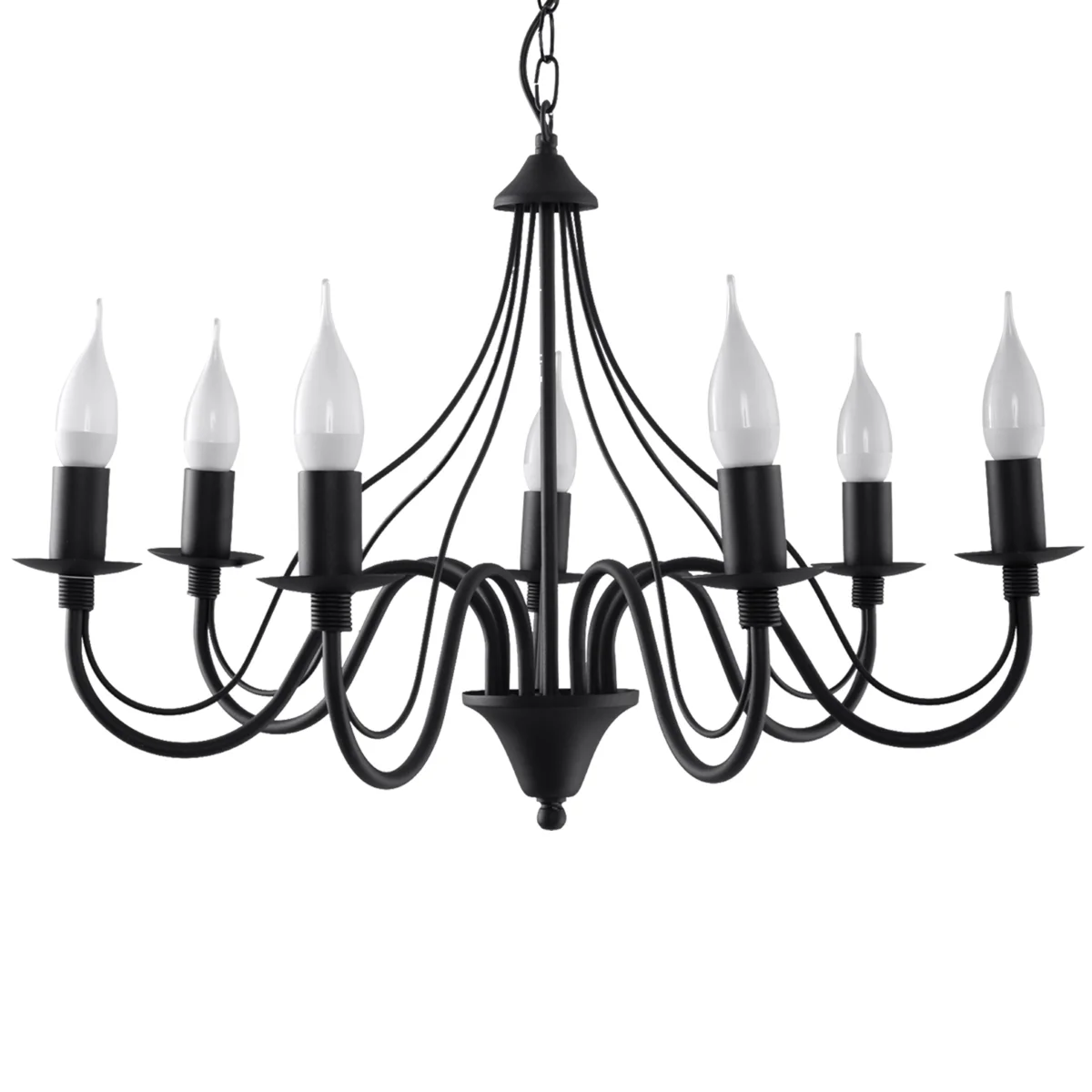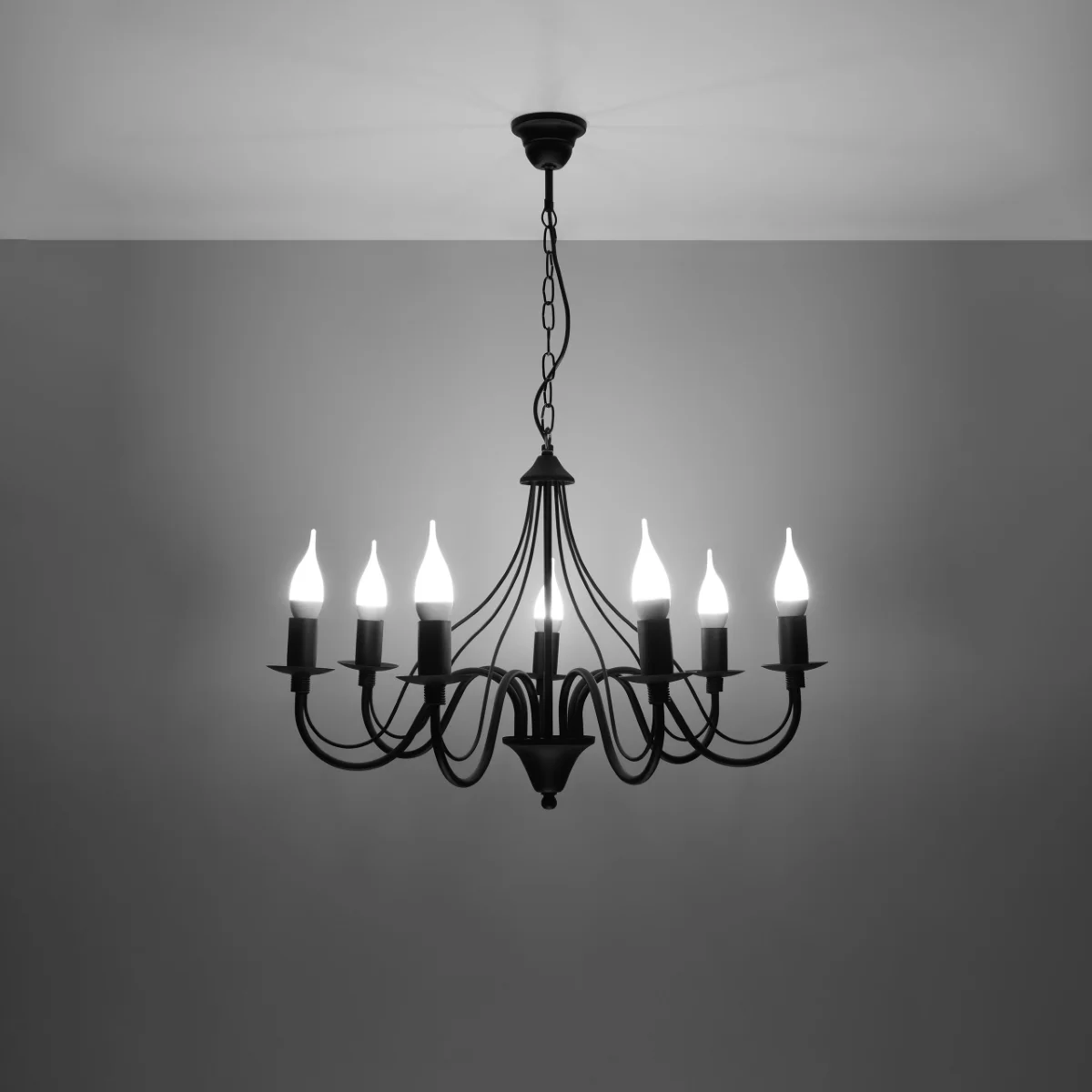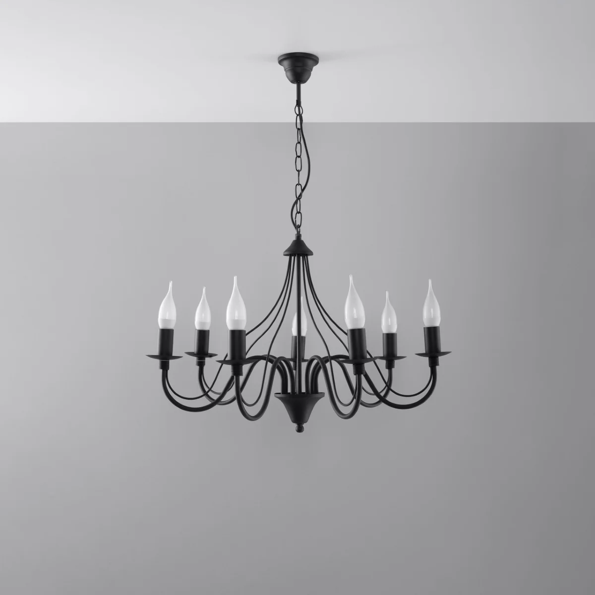 Sveče, nameščene na ukrivljenih kovinskih rokah, so izjemno učinkovit element notranjosti. Serija MINERVA svetilk bo všeč tudi največjim poznavalcem, ki cenijo izvirne predmete in prefinjene aranžmaje. Elegante svetilke, navdihnjene s svečniki, v preprosti, klasični obliki lahko odlično dopolnijo tako tradicionalno kot sodobno opremljen prostor. Ali bo ta bolj v surovem slogu ali poln okrasnih elementov, te svetilke mu bodo dale edinstven značaj. || Žarnica: E14, 7x40W, 7x12W LED, 50-60Hz, ~ 220-230V, IP20, razred naprave I Žarnica ni vključena. Dimenzije: 60/60/80 cm Material: jeklo Barva: črna
