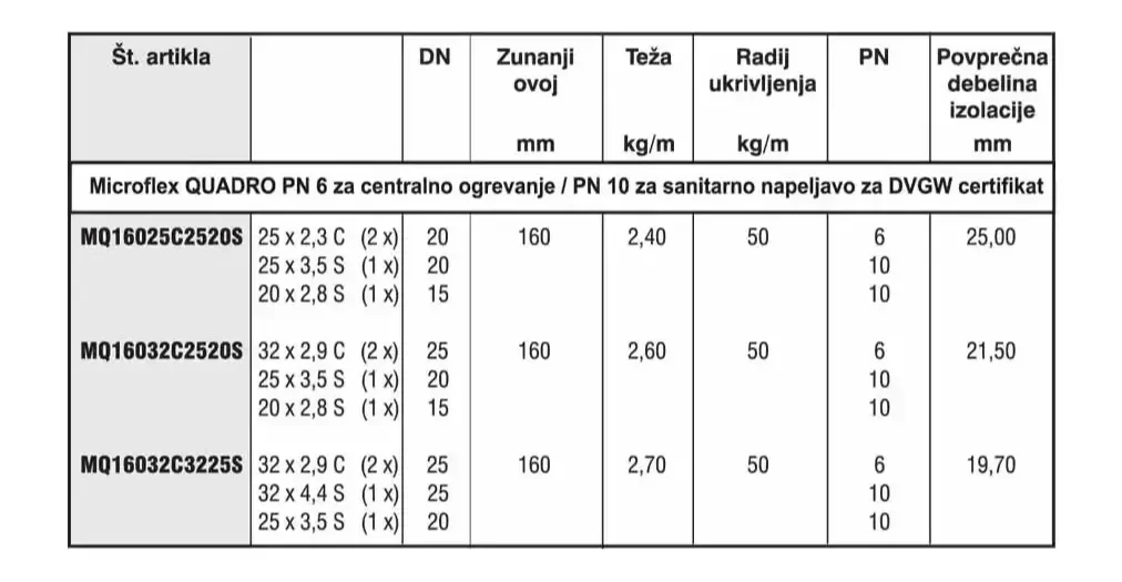 Microflex Quadro – predizolirana cev PE-Xa kvalitete s protizračno bariero se uporablja pri napeljavi centralnega ogrevanja in sanitarne vode. Proizvedena je po DIN16892 za temperaturo 95°C in pri tlaku 6 barov za centralno ogrevanje ter za temperaturo 95°C in pri tlaku 10 barov za sanitarno vodo. Omogoča napeljavo dovoda in povratnega voda. Večplastna termična izolacija je narejena iz polyetilena.