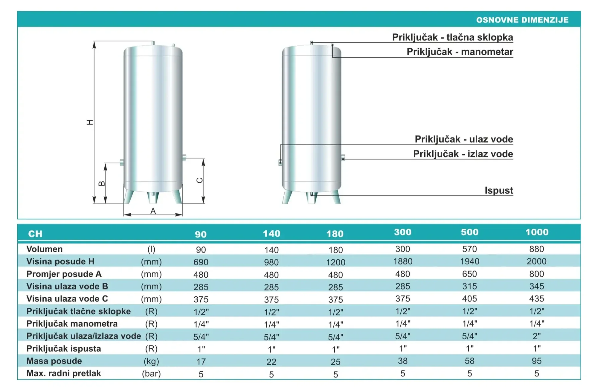 Hidroforske posode Centrometal serije CH so primerne za shranjevanje sveže pitne vode v gospodinjstvu, restavracijah in drugih objektih. Narejene so iz nerjavečega jekla kar pripomore pri zagutavljanje najzahtevnejših higijenskih standardov glede pitne vode in tudi drugod v raznih tehnoloških procesih v industriji.