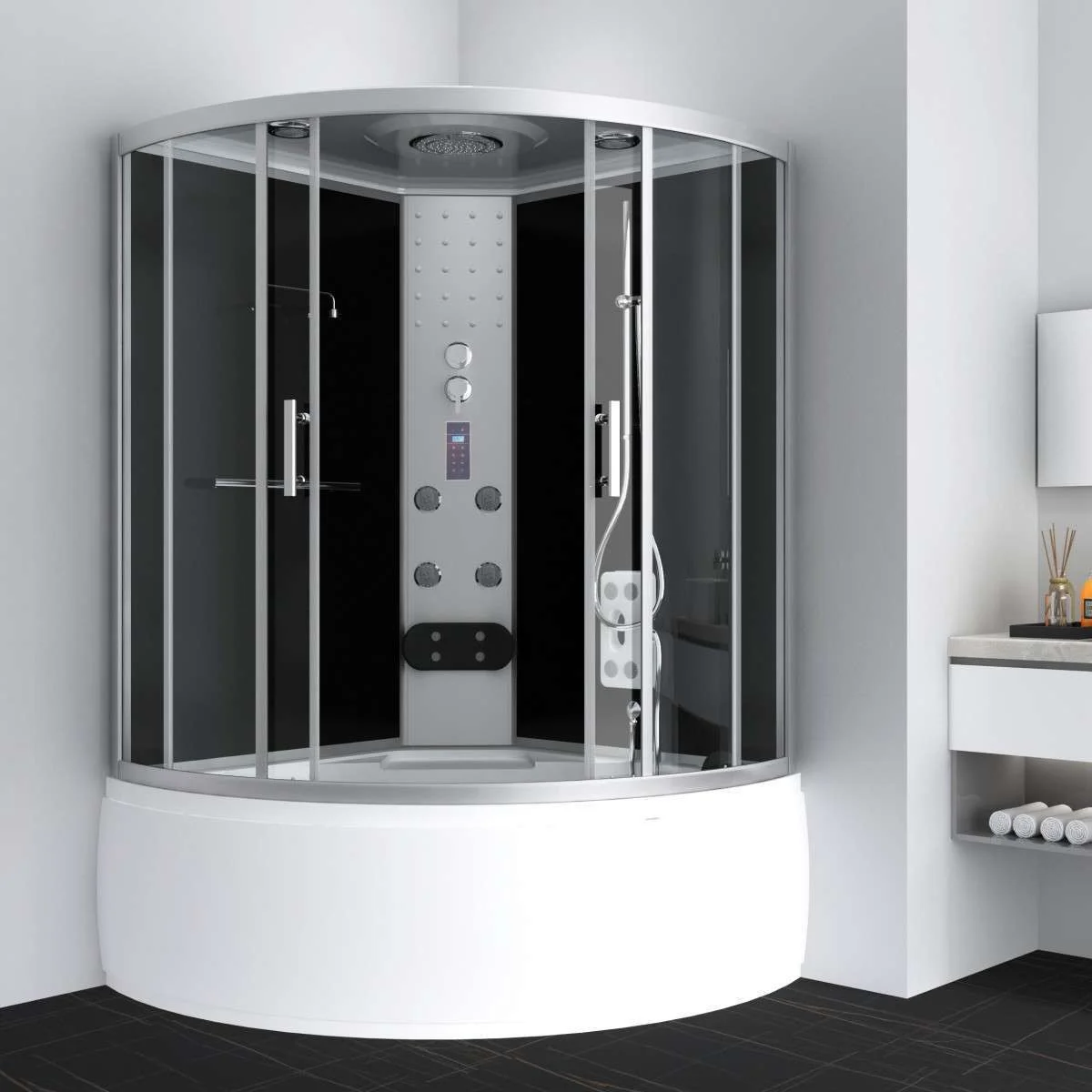 DAMPFDUSCHKABINE 129X120X215 CM || Pršna tuš kabina - velikost 120x120x215 cm - 5 mm sivo prednje steklo - 4 mm zadnje steklo - ALU profili v srebrni barvi - ABS-rocka v krom barvi - ABS dvojni kolešcki zgoraj in spodaj - 5 funkcij mešalnika (hrbtne šobe, masažne šobe, izliv, naglavna prha, tuš rocka) - tuš rocka s 3. funkcijami - srednji del v srebrni barvi z osvetljavo ozadja, 8 hrbtnih šob in delna blazina - steklena polica zgoraj na levem hrbtnem stklu - masažne šobe spodaj na desnem hrbtnem steklu - izliv na zgornjem sredinskem predelu kadi - blazina na vsaki strani kadi - parni generator