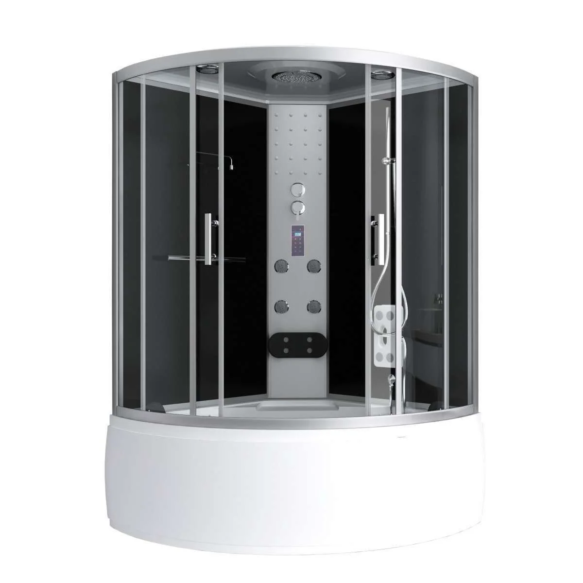DAMPFDUSCHKABINE 130X130X215 CM || Pršna tuš kabina - velikost 130x130x215 cm - 5 mm sivo prednje steklo - 4 mm zadnje steklo - ALU profili v srebrni barvi - ABS-rocka v krom barvi - ABS dvojni kolešcki zgoraj in spodaj - 5 funkcij mešalnika (hrbtne šobe, masažne šobe, izliv, naglavna prha, tuš rocka) - tuš rocka s 3. funkcijami - srednji del v srebrni barvi z osvetljavo ozadja, 8 hrbtnih šob in delna blazina - steklena polica zgoraj na levem hrbtnem stklu - masažne šobe spodaj na desnem hrbtnem steklu - izliv na zgornjem sredinskem predelu kadi - blazina na vsaki strani kadi - parni generator