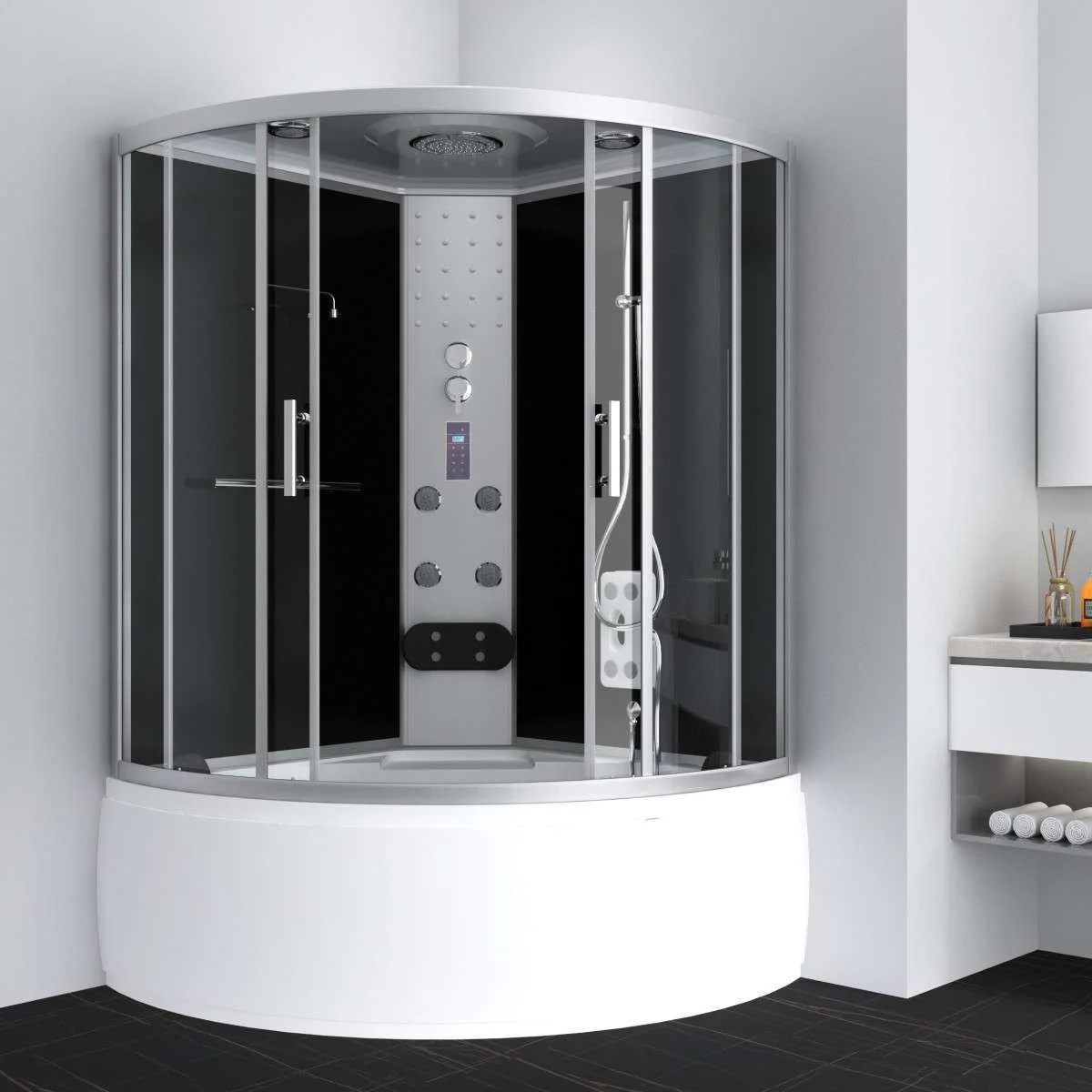 DAMPFDUSCHKABINE 130X130X215 CM || Pršna tuš kabina - velikost 130x130x215 cm - 5 mm sivo prednje steklo - 4 mm zadnje steklo - ALU profili v srebrni barvi - ABS-rocka v krom barvi - ABS dvojni kolešcki zgoraj in spodaj - 5 funkcij mešalnika (hrbtne šobe, masažne šobe, izliv, naglavna prha, tuš rocka) - tuš rocka s 3. funkcijami - srednji del v srebrni barvi z osvetljavo ozadja, 8 hrbtnih šob in delna blazina - steklena polica zgoraj na levem hrbtnem stklu - masažne šobe spodaj na desnem hrbtnem steklu - izliv na zgornjem sredinskem predelu kadi - blazina na vsaki strani kadi - parni generator